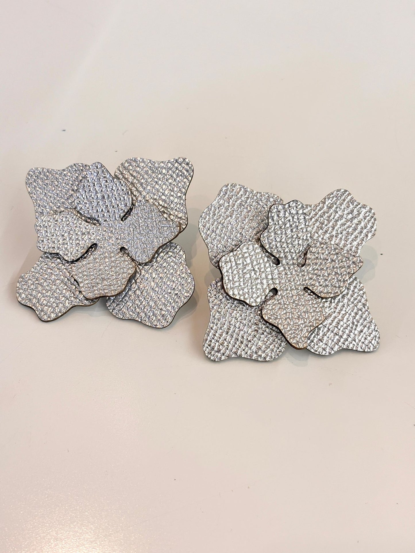 Eco-leather lobe earrings with superimpositions of very light petals