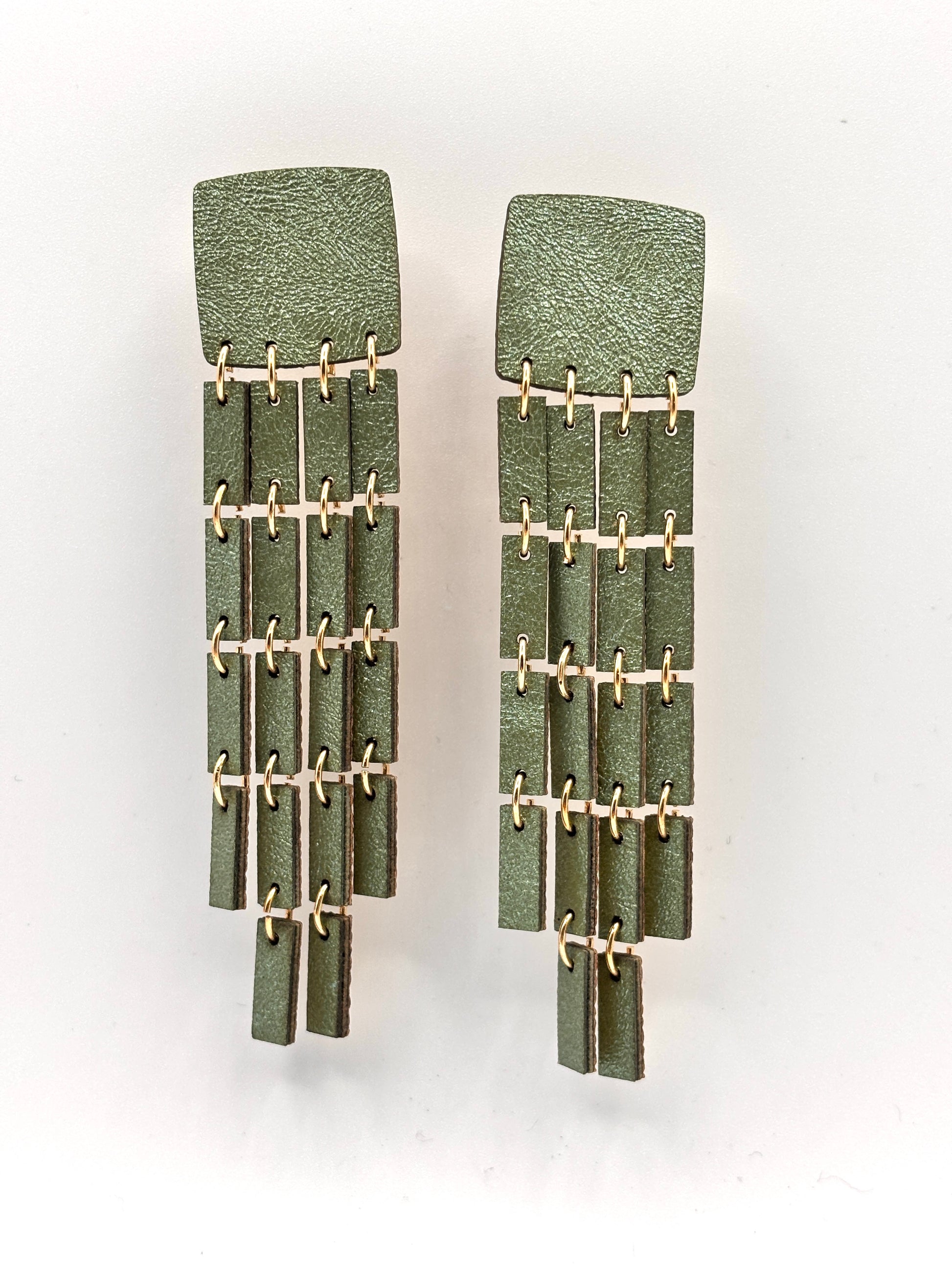 Orecchini in leggerissima ecopelle, composti da piccoli rettangoli che uniti tra loro creano un elegante gioco di movimento e geometrie.