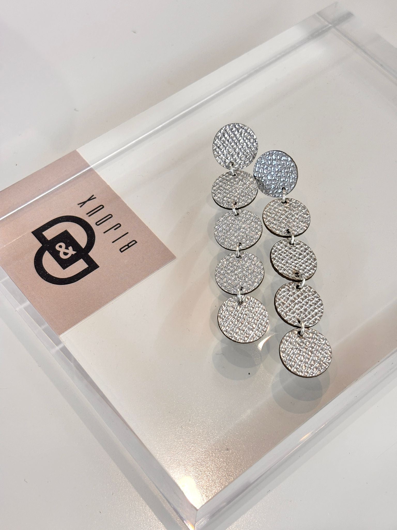 Orecchini in ecopelle, leggeri ed eleganti, illuminano il look con una cascata di cerchi texturizzati che riflettono la luce ad ogni movimento.