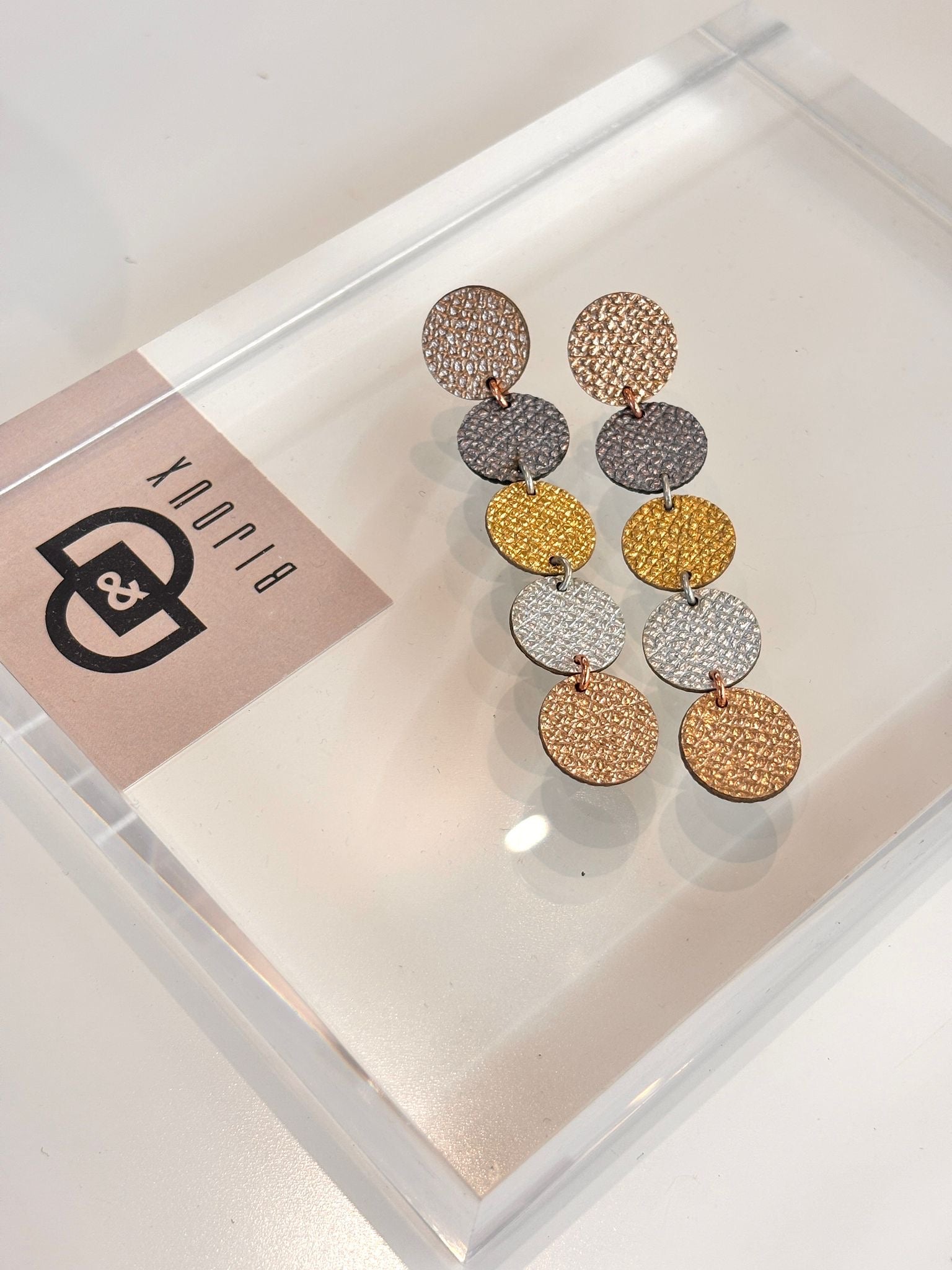 Orecchini in ecopelle, leggeri ed eleganti, illuminano il look con una cascata di cerchi texturizzati che riflettono la luce ad ogni movimento.