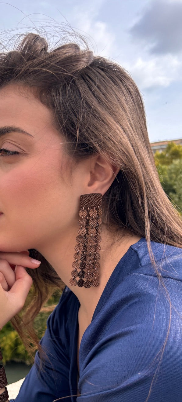 Una cascata di bollicine in leggerissima ecopelle dà vita agli orecchini SCINTILLE, pensati per illuminare il viso con un gioco di luci e movimento.