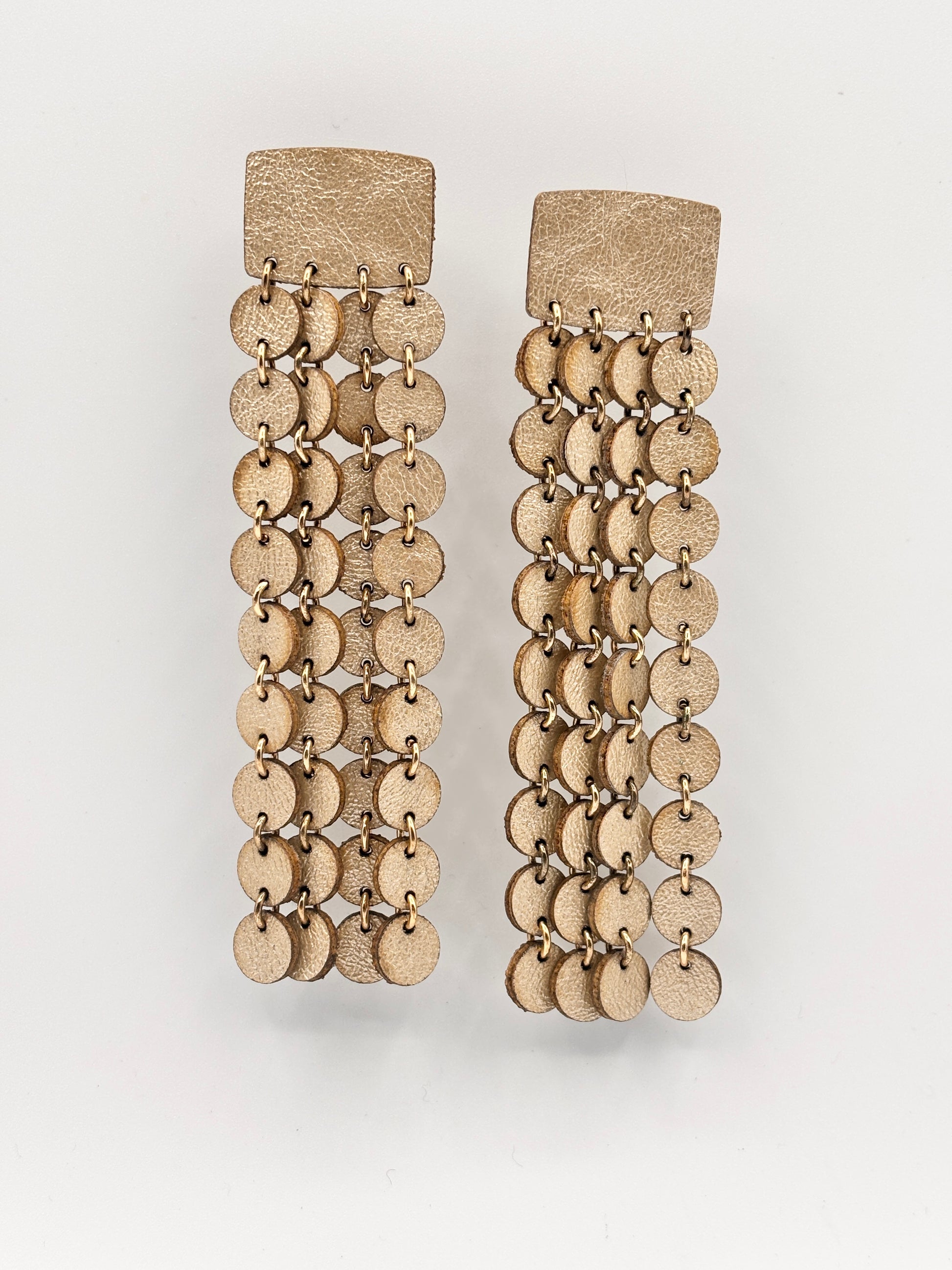 Una cascata di bollicine in leggerissima ecopelle dà vita agli orecchini SCINTILLE, pensati per illuminare il viso con un gioco di luci e movimento.
