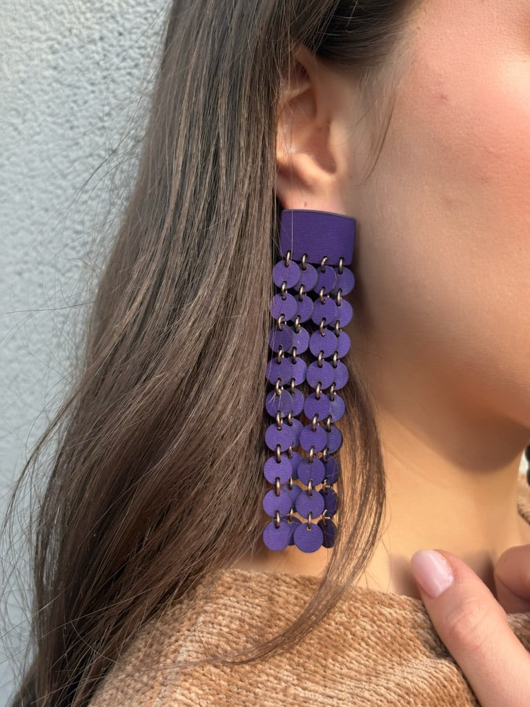 Una cascata di bollicine in leggerissima ecopelle dà vita agli orecchini SCINTILLE, pensati per illuminare il viso con un gioco di luci e movimento.