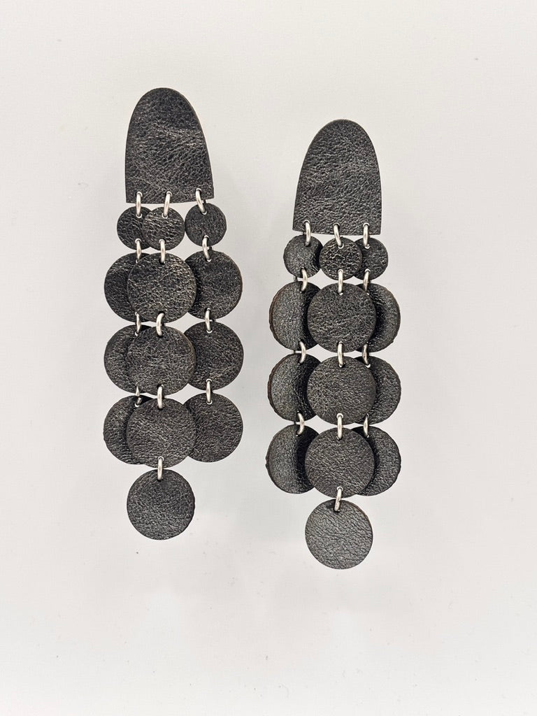 Gli orecchini SOFFIO, reinterpretano il classico chandelier con una cascata di piccole monete in leggerissima ecopelle che unisce movimento e raffinatezza.