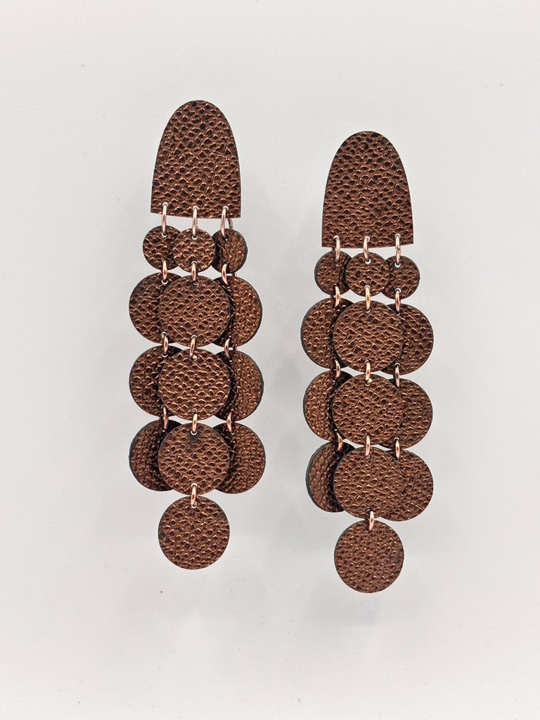 Gli orecchini SOFFIO, reinterpretano il classico chandelier con una cascata di piccole monete in leggerissima ecopelle che unisce movimento e raffinatezza.