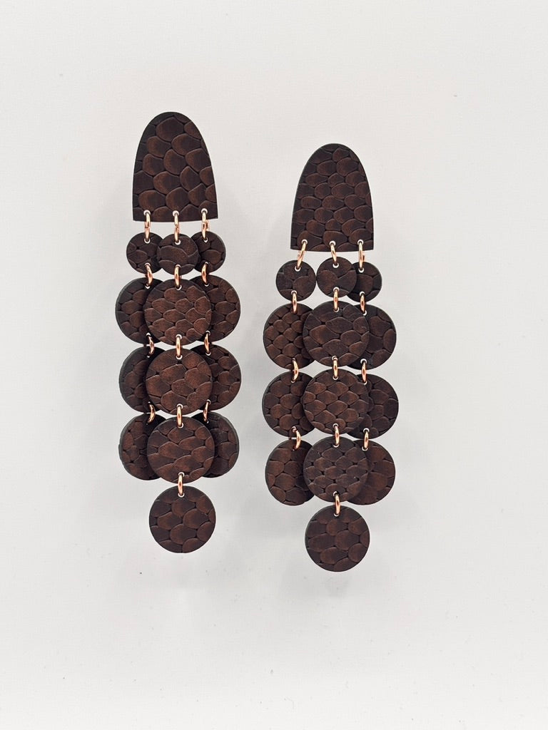 Gli orecchini SOFFIO, reinterpretano il classico chandelier con una cascata di piccole monete in leggerissima ecopelle che unisce movimento e raffinatezza.